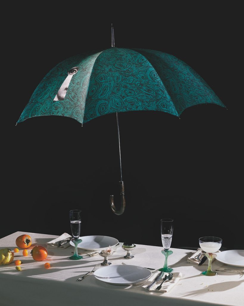 L’art s’invite avec humour dans l’univers Fornasetti , un clin d’œil au surréalisme où un joli parapluie Serratura su Malachite est en suspension dans l’espace, la table devient imaginaire et réel . http://www.fornasetti.com
